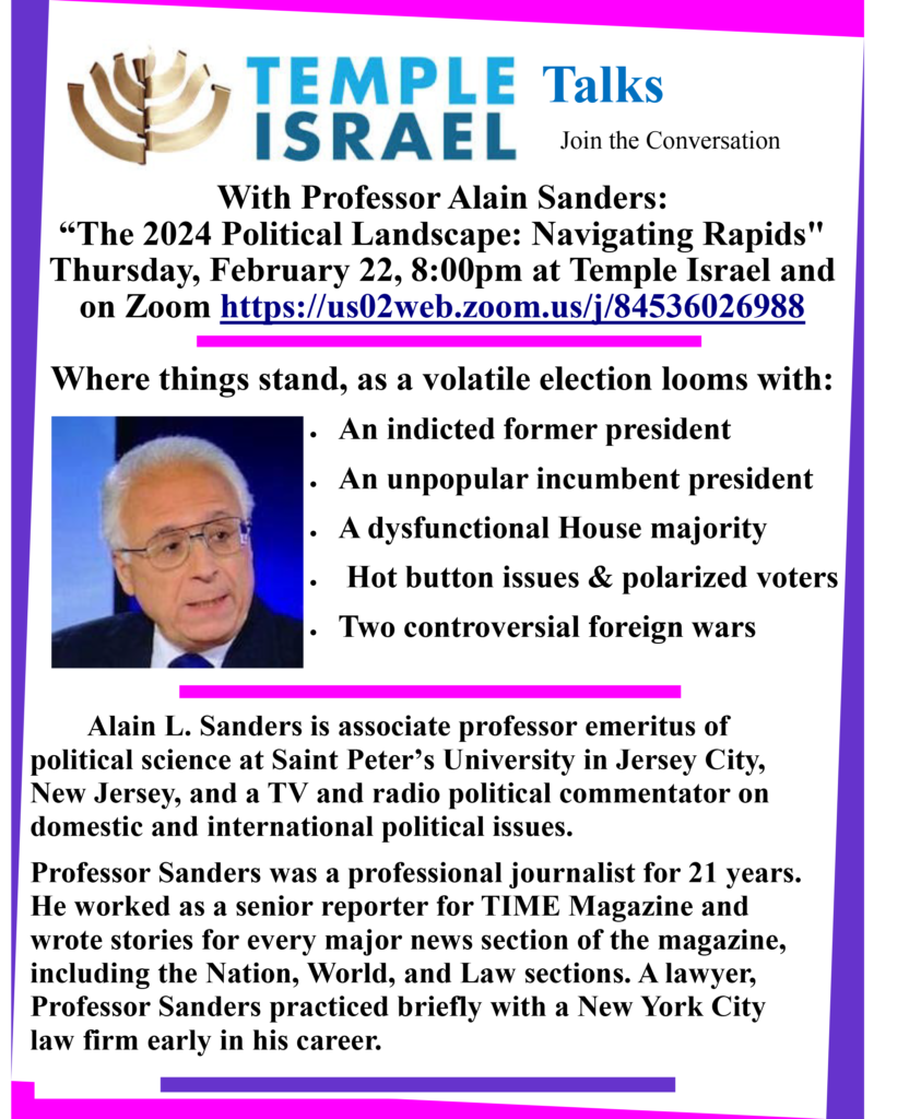 On Thursday, February 22nd, at 8:00 p.m., Alain L. Sanders, Associate Professor Emeritus of Political Science at Saint Peter’s University, will discuss “The 2024 Political Landscape: Navigating Rapids” at Temple Israel of Ridgewood and on Zoom.
