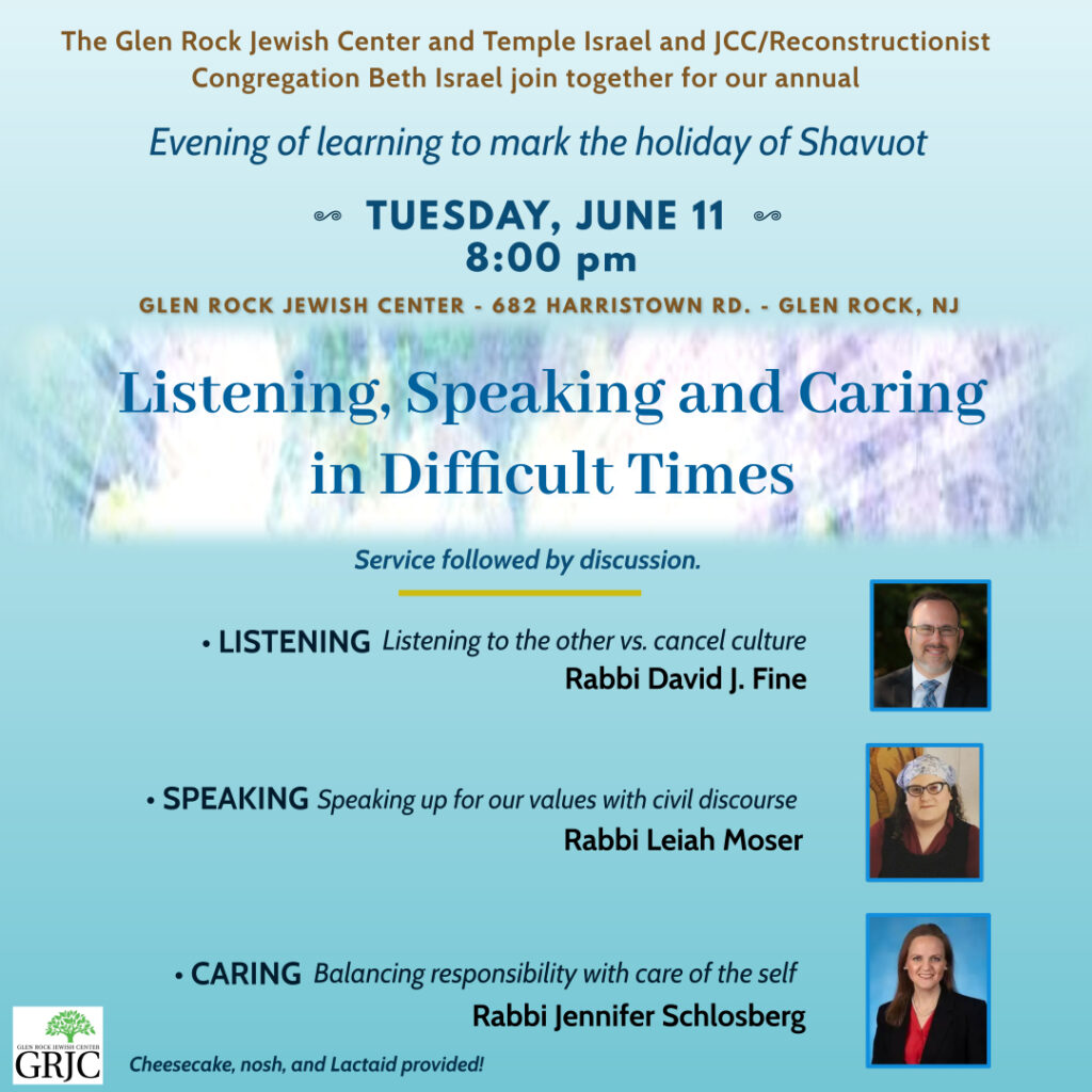The Glen Rock Jewish Center, Temple Israel, and JCC/Reconstructionist Congregation Beth Israel join together for our annual evening of learning to mark the holiday of Shavuot.